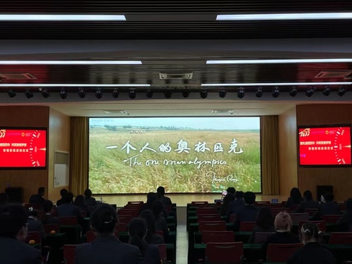 之后在场的同学们纷纷上台,举起手中的橙子与老师亲切合影。随后,老师与同学们一同观看青橙影院首部影片——《一个人的奥林匹克》。