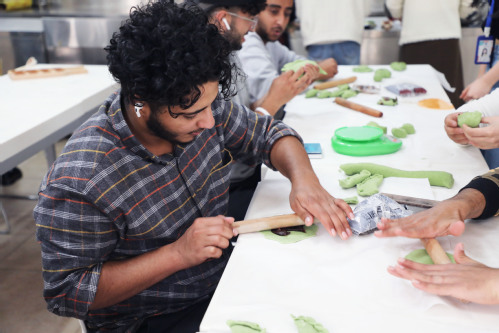 紧接着,同学们来到酒店管理学院的演示厨房,在制作师的讲解和指导下,同学们开始了艾糕和艾饺的制作之旅。他们捏着手中的面粉,放入模具中按压成型,最后进行脱膜,艾糕便初步完成,或是在擀薄的面粉中放入豆沙馅儿,再包成饺子状。在师生的欢笑合作中,各种奇思妙想在脑海中应运而生,一团团普通的面粉在他们手中变为精致小巧的艾糕和立体的艾饺。经过最后的蒸煮,艾糕和艾饺新鲜出炉。大家迫不及待地品尝了自己的劳动成果,对于第一次品尝的留学生来说,艾糕、艾饺充满春天气息的色彩和独特的口感让他们品尝到了晴明的味道。