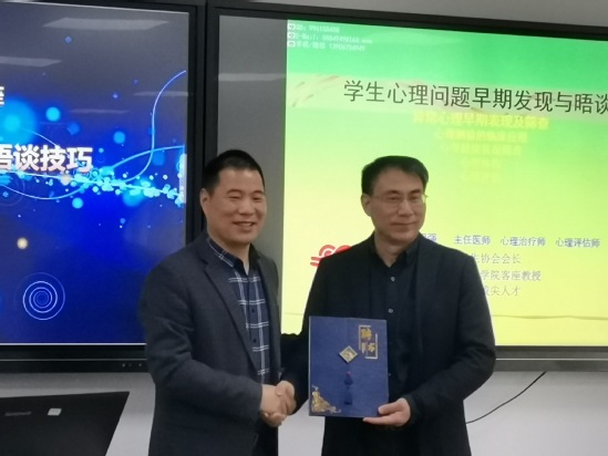 仪式后进入了主题讲座环节。田国强医师以“学生心理问题的早期发现及晤谈技巧”为主题,从“怎样与心理需求学生晤谈”、“如何早期发现学生心理问题”以及“如何初筛学生的心理问题”等方面和与会者做了阐述和分享,向大家介绍了世界卫生组织定义的“健康”及“中国人的心理健康标准”,也以精神科主任医师、心理治疗师的角度教大家如何区分正常与不正常的心理。讲座没有过多华丽的词藻,但却非常接近辅导员们的实际工作,一个又一个的心理治疗案例令大家听得十分投入,也同时引发了心理、思政工作方面的思索与提问。田医师也结合实际解答了现场部分辅导员在思政、心理教育工作中遇到的难点问题,传授了心理谈话技巧,令在场老师受益匪浅。
