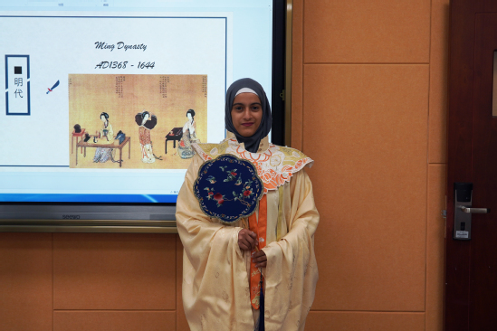 随后,三名中国学生依次介绍展示了唐代、宋代、明代的汉服,包括头饰、裙摆的刺绣、汉服的面料、汉服的构造等各方面。可以说,汉服承载的不仅是一种生活美学,更是无数人生活方式的延续。美轮美奂的汉服让留学生们叹为观止,也门学生哈南迫不及待地进行试穿,展示了一种别样的汉服异域风情。