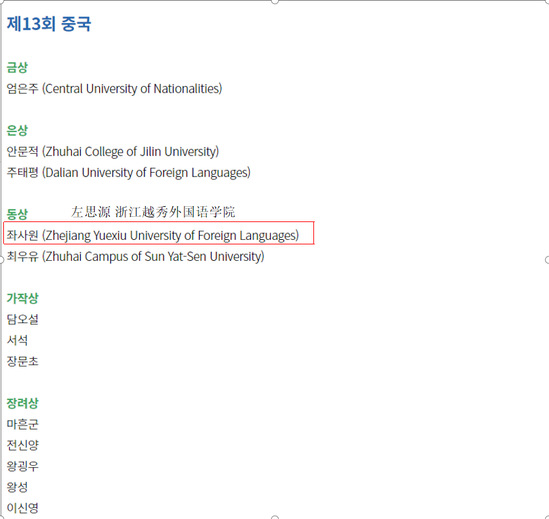 5月25日,第十三届“成均韩文写作大赛”获奖名单揭晓,我院朝鲜语1805班左思源同学荣获中国赛区铜奖,这是朝鲜语专业学生首次参赛并获得的奖牌!
