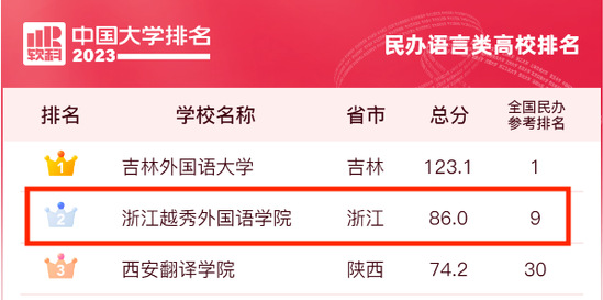 高等教育专业评价机构软科于近日正式发布“2023软科中国大学排名”,浙江kaiyun官方网站手机版外国语学院以86.0分位列“2023软科中国民办高校排名(语言类)”第2位,民办高校总榜排名跃居第9位。学校社会评价逐年提升,高质量发展初显成效。