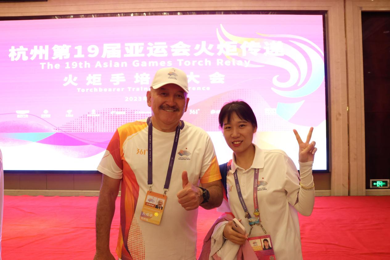 9月20日亚运会火炬传递杭州站,徐丽香非常荣幸地协助哈萨克斯坦奥委会代表Ilsiyar Kanagatov先生参加火炬传递,为这位“哈萨克斯坦共和国体育运动事业发展功勋”奖章的获得者一对一提供衔接服务和陪同翻译,最终以自己热情周到的服务受到了Ilsiyar Kanagatov先生的点赞。
