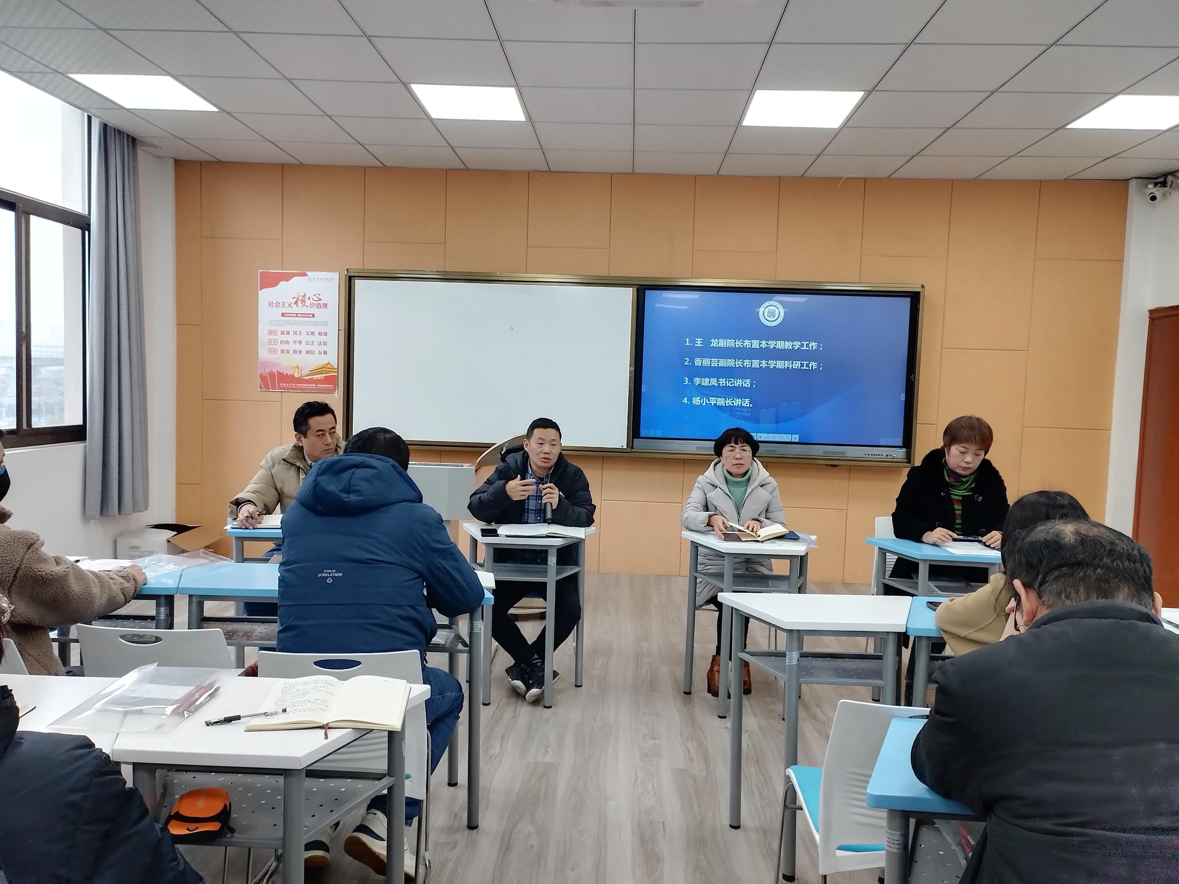杨小平院长对上一学期全体教师的辛勤付出和取得的教科研成果表示了高度肯定和衷心感谢,并部署新学期任务。一是借助数字技术基本工具,培养应用创新人才;二是强化师资队伍建设,均衡各系部师资水平;三是以学生为中心,深化教育教学改革;四是优化服务模式,综合办、学工办面向老师、面向教学、面向科研做好保障服务。