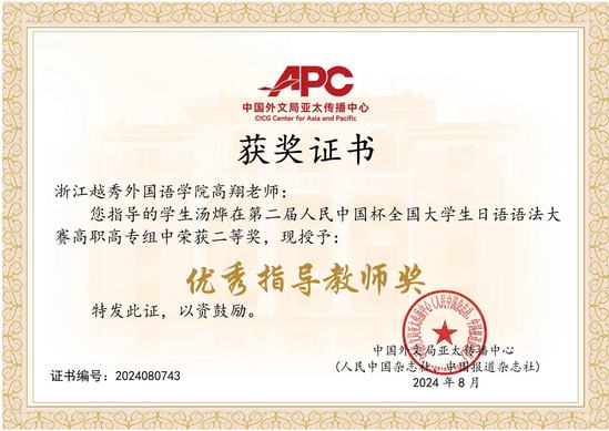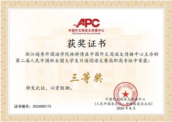 据悉,“人民中国杯”全国大学生日语系列大赛的参赛对象为全国高校在校大学生及广大日语学习者,共分为研究生组、本科生组、高职高专组、大学公共日语组。我院学子在该系列赛事中取得佳绩,不仅通过比赛提升了自己的日语语法能力、阅读能力,也为学校争得了荣誉,充分展示了我院专业的教学水平与整体实力。