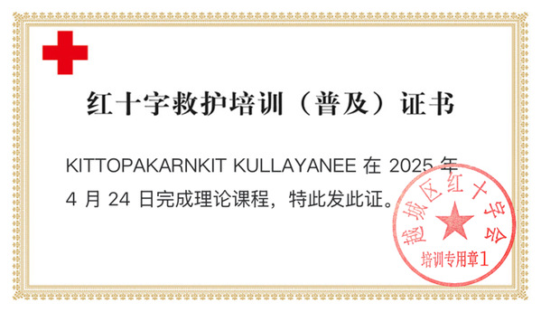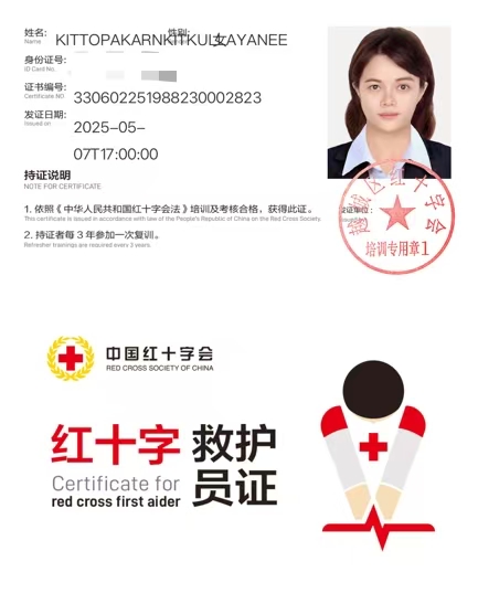 近日,我校泰国籍外教郭贤(KULLAYANEE KITTOPAKARNKIT)顺利通过越城区红十字会应急救护培训考核,取得救护员证书。她表示:“掌握急救技能不仅是对自身保护,更是对身边人的一份责任。‘人道、博爱、奉献’是红十字精神的核心,我希望能在关键时刻伸出援手,帮助有需要的人。”
