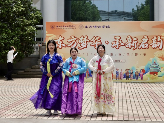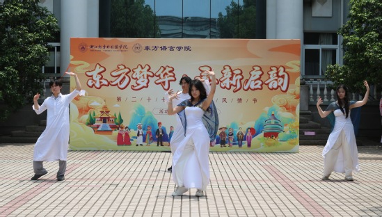 2025年5月22日中午,东方语言学院第27届东方风情节在我校稽山校区西门SPT街盛大开幕。东方语言学院院长邱鸣、党委书记陶凤、副院长胡燕静、党委副书记章含知、院办主任诸东娟、各系主任及学院师生代表到场参加活动。
