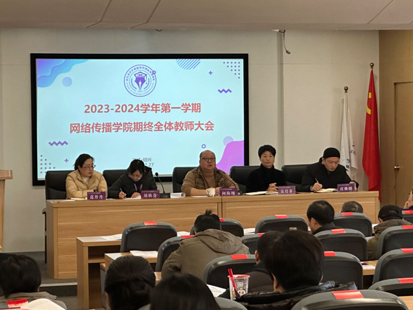 12月27日下午,2023-2024学年第一学期网络传播学院期末全体教师大会在4-301顺利召开。本次会议由学院党委书记吴月齐主持,学院院长何海翔院长、胡秋芬副院长、庄焕明副院长、葛丹丹副书记及全体教师出席本次会议。会议伊始,吴月齐书记传达了关于深入学习贯彻落实全国纪念毛泽东同志批示学习推广“枫桥经验”60周年暨习近平总书记指示坚持发展“枫桥经验”20周年大会精神和内容,共同学习了《关于规范党员干部网络行为的意见》的内容,要求全体教职工规范一言一行,做好学生的榜样。随后学院其他领导围绕各自职责分工对教学、科研、学生工作各块进行了部署安排,并对本学期教学工作、科研工作、招生就业、外事等工作进行汇报,分析了存在问题,分享了取得成绩。会议最后,何海翔院长传达了本科评估预评估专家们第一天的反馈意见,要求学院全体教师一定要提高站位、高度重视、上下齐心、责任到人,高度重视现在发现的问题,第一时间研究讨论解决的办法,确保明年教育部审核评估顺利通过。他强调学院将进一步推进学科专业的梯队化建设,稳步推动学院工作提质增效,老师们一定要有危机意识,守住教书育人的主业,摆正工作心态,积极探索和坚守自己研究领域