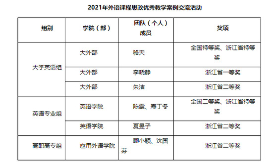 2021年,我校教师在教学竞赛也取得可喜成绩。在12月举行的第三届“全国高校混合式教学设计创新大赛”决赛中,我校陈霞老师参赛的课程《高级英语视听说》,获得全国二等奖;张悦老师参赛的课程《跨文化交际》获“设计之星”奖;12月11日,2021年外语课程思政优秀教学案例交流活动全国总决赛在线上举行,我校骆天老师获大学英语组“特等奖”,陈霞和寿丁冬老师团队获“英语类专业组二等奖。”