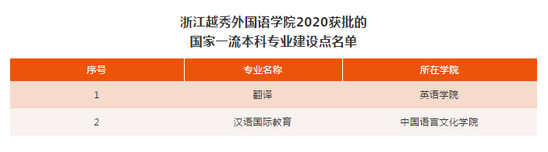 3月1日,教育部公布了2020年度国家级一流本科专业建设点名单,我校翻译、汉语国际教育两个专业获批“国家级一流本科专业”建设点。这是继2019年国家级一流课程取得突破后我校在专业建设方面的又一重大突破。2021年我校省级一流专业数量再创新高,目前浙江省级一流专业数已达8个。