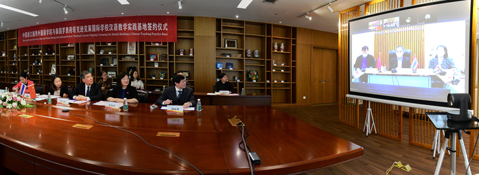 4月20日上午,我校与泰国罗勇府Taksin Klaeng国际学校举行合作建立汉语教学实践基地、开展汉语教学的线上签约仪式。校长叶兴国、副校长葛金玲以及国际交流合作处、教务处和中国语言文化学院相关领导、老师参加签约仪式。参加签约仪式的泰方代表有泰国教育部前副次长Mr. Peera Ratanawichit、泰国罗勇府行政处副主席Mr. Prasarn Pruksachat、罗勇府政府教育处主任Ms.Ratri Khumyat、罗勇府行政处秘书长Mrs. Supannee Suksanrunguang、Taksin Klaeng国际学校董事会董事长Mr.Witit Lawansathien、罗勇府语言中心Mr. Supakrit Khajatwitchayanukul Taksin、Taksin Klaeng国际学校校长Mrs. Sumalee Thavornwiriyanan、泰国教育部中文课程开发委员会委员罗成等官员及教师代表。