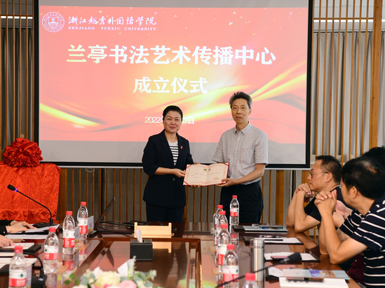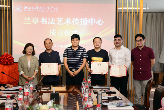 9月23日,兰亭书法艺术传播中心成立揭牌仪式在我校镜湖校区图书馆举行。兰亭书法艺术传播中心是由浙江kaiyun官方网站手机版外国语学院与兰亭书会共同合作筹建成立,旨在进一步助力绍兴东亚文化之都建设,面向国境外开展书法艺术交流合作,讲好中国故事,传播中国文化。绍兴市文广旅游局党委副书记、副局长杨坚祥;绍兴市人民政府外事办公室党组成员、绍兴市人民对外友好协会专职副会长张飙;绍兴市文联副主席叶树明;兰亭书会副会长兼秘书长倪七一;兰亭书会副会长喻革良、周俊友、谢权熠;兰亭书法艺术传播中心顾问陈理平;兰亭书法艺术传播中心首批特邀研究员代表王旭初、赵技峰、朱良;学校常务副校长魏小琳、副校长葛金玲出席成立揭牌仪式。学校国际合作交流处处长王景、艺术学院党委书记杨叶玲、艺术学院特聘专家梁少膺、党委宣传部副部长孔勇、国际合作交流处副处长黄旦华参加了成立揭牌仪式。
