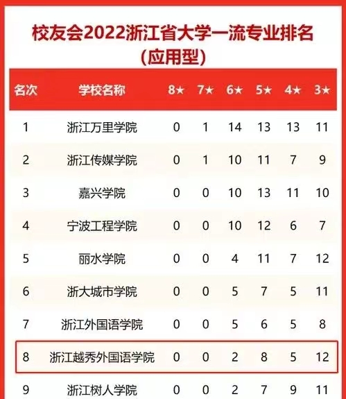 4月,全国第三方大学评价机构艾瑞深校友会网(Cuaa.Net)发布2022校友会中国一流专业排名、浙江省一流专业排名。在应用型高校排名中,我校位居前8名。其中,汉语国际教育专业全国排名第二、全省排名第一,翻译专业全国排名第四、全省排名第二,这2个专业列为六星级专业。国际商务、朝鲜语、商务英语、编辑出版学、酒店管理、德语、法语、传播学等 8个专业列为五星级专业。