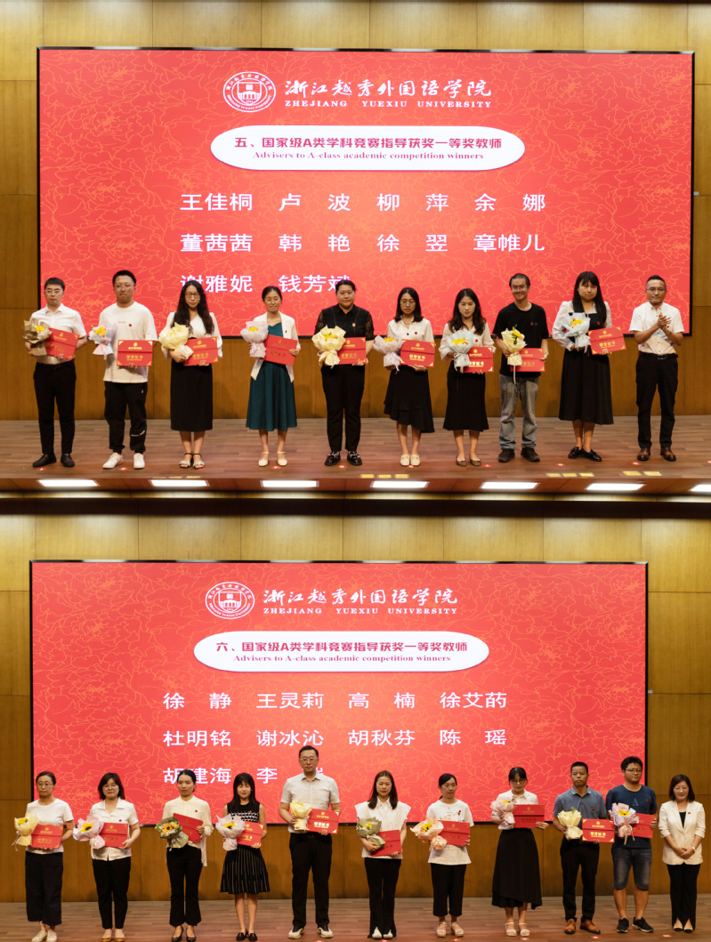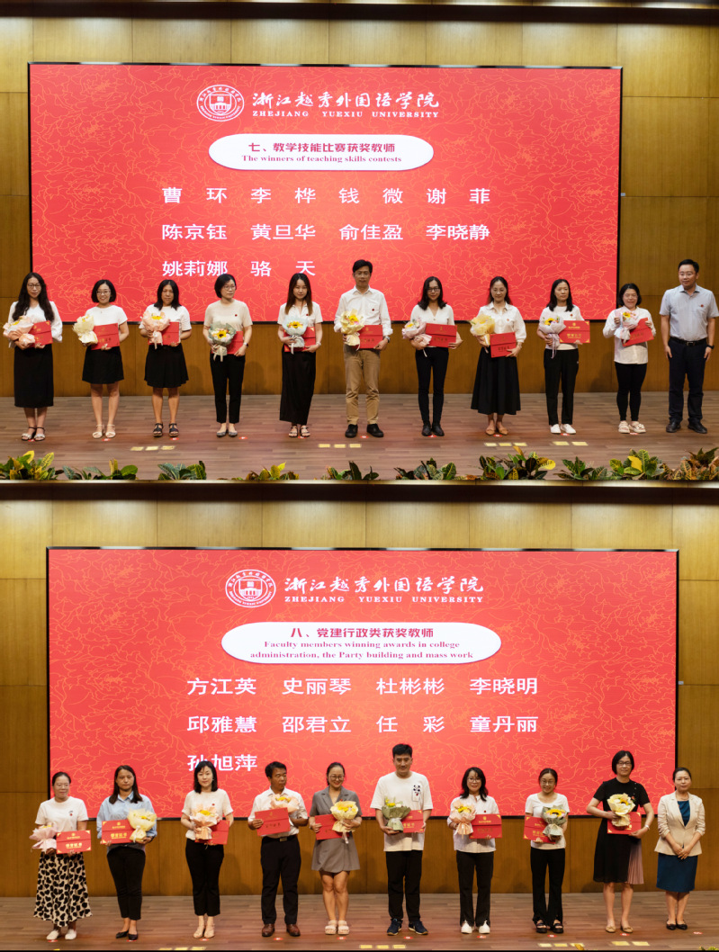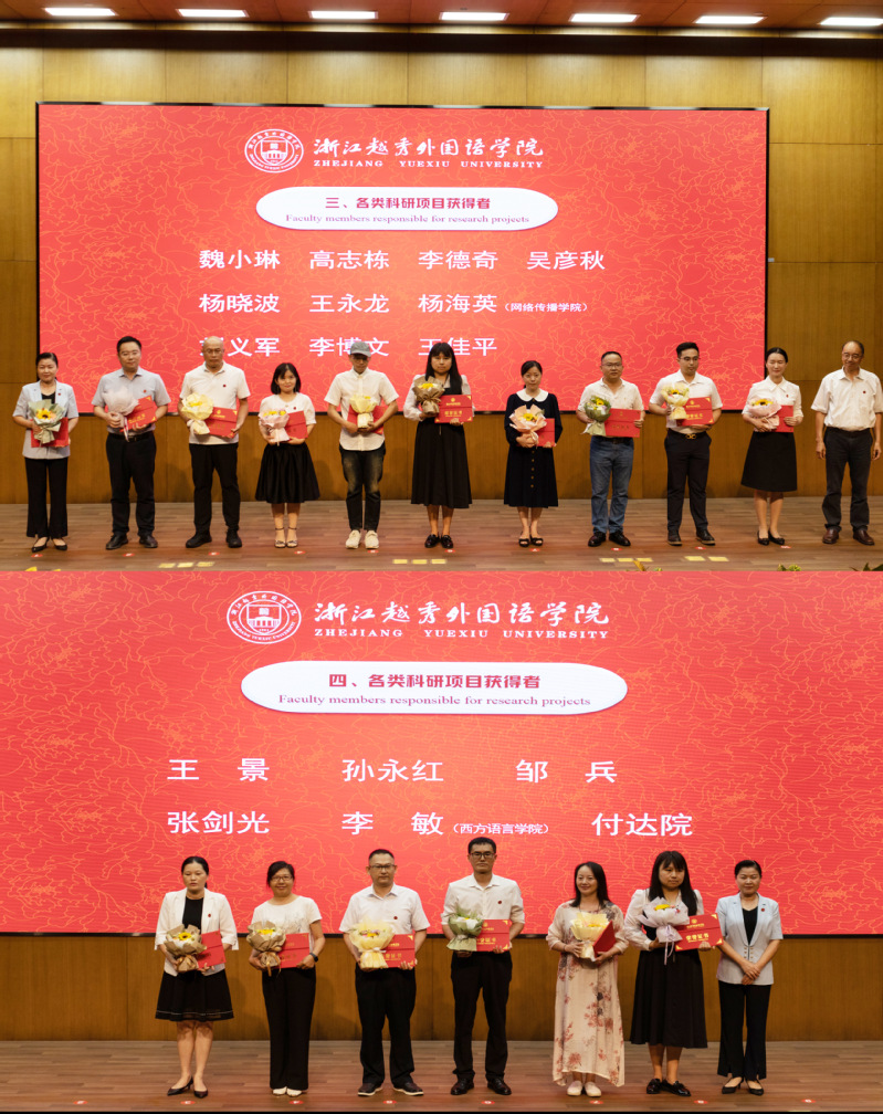 费君清教授宣读《浙江kaiyun官方网站手机版外国语学院关于表彰2022-2023学年先进集体与个人的决定》。会议对过去一年深耕育人、担当作为的先进集体和个人进行表彰,展现了新时代教师有理想信念、有道德情操、有扎实学识,有仁爱之心的良好精神风貌。
