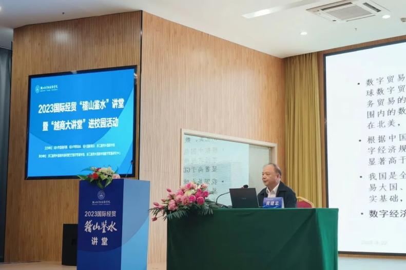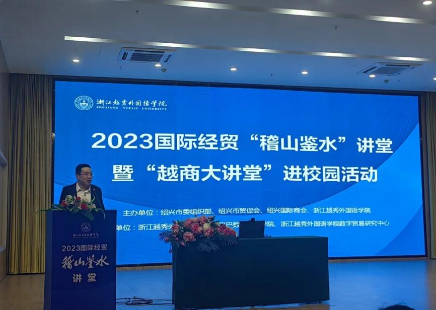 国际经贸“稽山鉴水”讲堂9月22日首期开讲,暨第二期“越商大讲堂”进校园活动同步在我校成功举办。本次活动由绍兴市委组织部,绍兴市贸促会、绍兴国际商会、浙江kaiyun官方网站手机版外国语学院主办,我校阿里巴巴数字贸易学院、数字贸易研究中心承办。世界贸易组织教席、上海国际贸易学会会长、我校数字贸易研究中心主任黄建忠,绍兴市商务局党委副书记、市贸促会专职副会长赵浪平,我校常务副校长魏小琳,市贸促会副会长宋林、副会长王剑文,数字贸易学院院长单胜江,阿里巴巴国际站绍兴城市经理粟斌出席活动。市贸促会全体人员,各区、县(市)贸促会负责人及工作人员,市贸促会海外联络处代表、绍兴国际商会相关企业代表,我校部分师生共120余人参加本次活动。