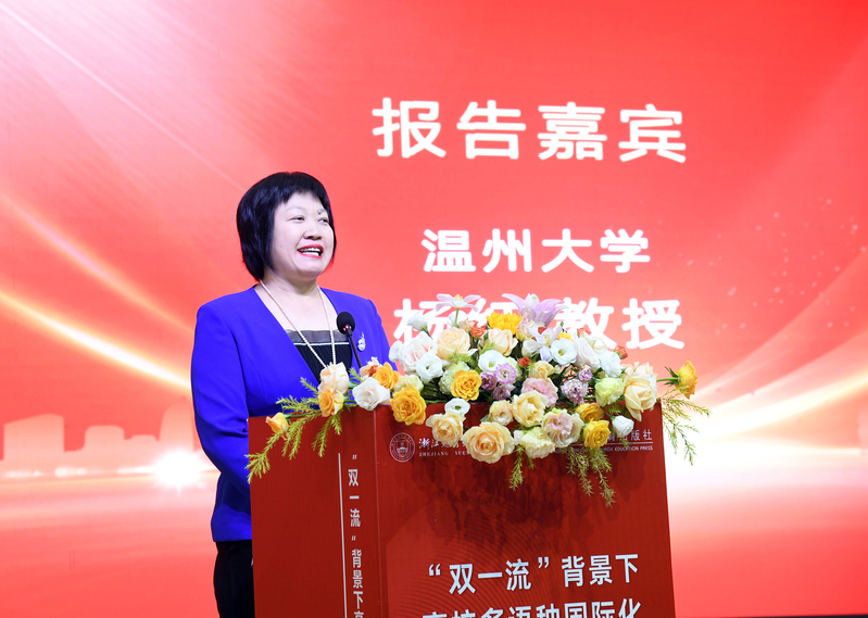 在下午场的专题报告中,温州大学杨红教授作了题为“‘双一流’背景下地方高校国际化人才培养路径研究与实践”的报告,介绍了温州大学外语专业在新文科背景下的新定位,提出外语专业可以通过服务地方、特色发展和差异竞争等方式突破当前困境。