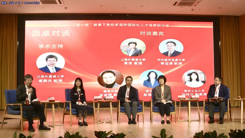 大会报告结束后,在北京外国语大学周异夫教授的主持下,五位专家围绕“‘双一流’建设中的国际交流与合作”这一主题进行了对谈。上海外国语大学的高洁教授指出,国际交流与合作在课程共建共享中发挥着重要作用,强调外语专业应坚持守正创新;对外经济贸易大学李运博教授着重介绍了对外经济贸易大学国际商务特色复合型外语人才培养模式,就后疫情时代如何发挥语言学科及国际化办学的特色和优势,以提升国际化建设水平提供了具体措施参考;南京大学张俊翔教授通过介绍南京大学特色“双向”国际交流与合作模式,指出国际化人才不仅应掌握多语种的语言能力,更应具备跨学科的思维方式;浙江大学赵佳教授从提升科研能力的角度,分享了浙江大学如何通过国际交流项目和国际化课程助力外语专业本科生科研创新能力培养;南京工业大学刘玲玉副教授以德语专业为例,介绍了通过“外语+师范专业”的新模式提升学生参加国际交流的意愿,从而丰富外语教学和国际化人才培养实践。