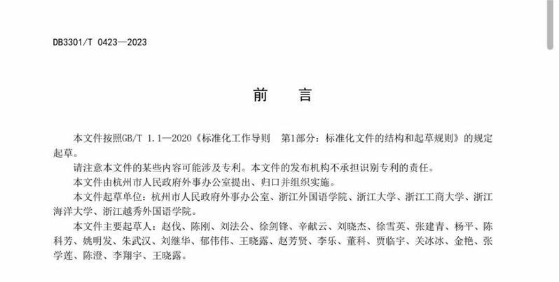 近日,杭州市市场监督管理局发布了《公共服务领域外文译写规范》,这是杭州市首份专门针对公共服务领域外文译写的地方标准。该标准将于2023年11月30日正式实施,成为浙江省首个市域范围内针对公共服务领域外文译写规范的地方标准。