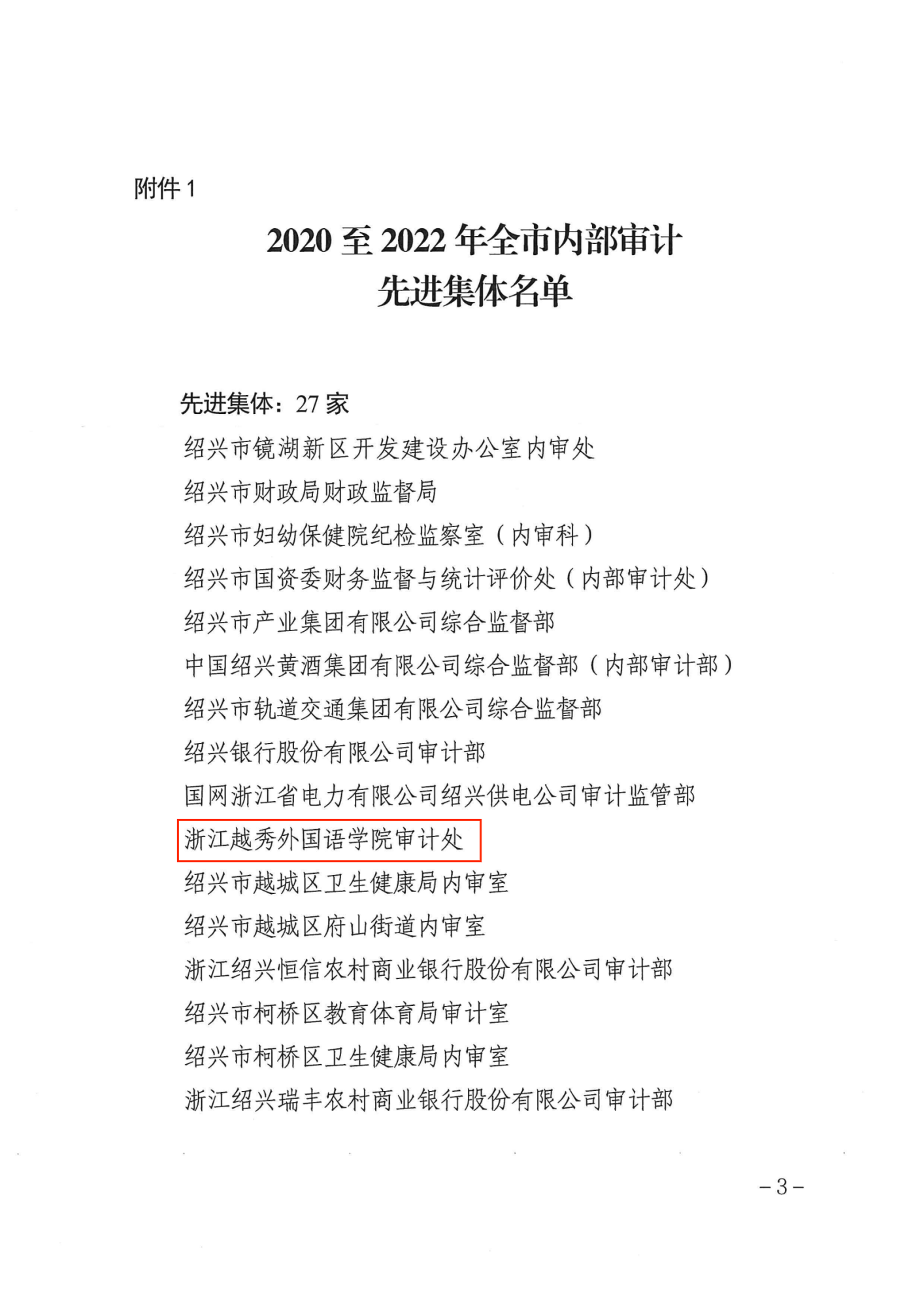 根据绍兴市内部审计师协会《关于2020至2022年全市内部审计先进集体和先进工作者的通报》(绍市内审协〔2023〕17号),我校审计处荣获“2020至2022年绍兴市内部审计先进集体”称号。此次先进集体表彰,我校审计处为唯一获评的高校内审机构,是校审计处自2014年成立以来首次获得的市级集体荣誉,是对我校内审工作的肯定和激励。
