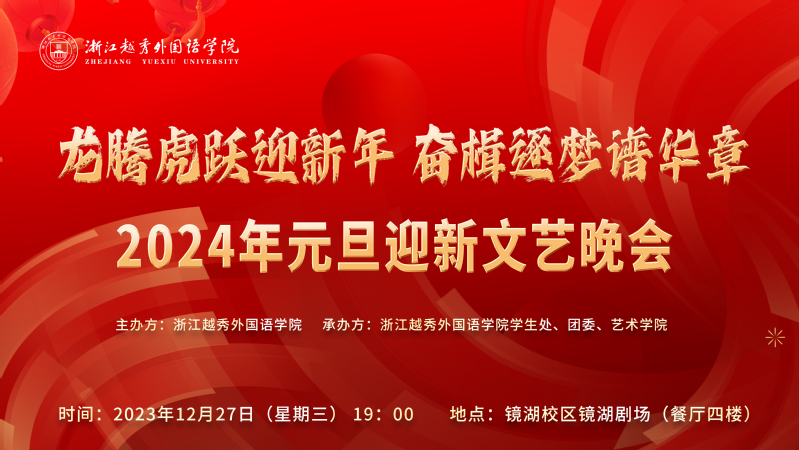 12月27日,学校2024年元旦迎新文艺晚会在镜湖校区镜湖剧场顺利举行。学校校长叶兴国、特聘教授费君清、常务副校长魏小琳、副校长陈文涛、副校长葛金玲,党委副书记兼纪委书记高志栋,党委副书记高琴波、校友总会会长徐左平,校友代表曾险、应华亮、王冰凌、朱新海、陈智,以及学生家长代表、师生代表、留学生和外教代表欢聚一堂,辞旧迎新。本次晚会线上视频直播、图片直播同步进行。