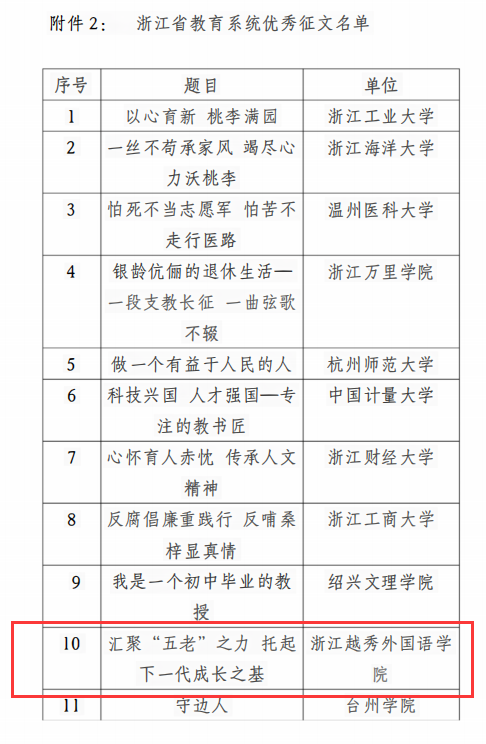 近日,浙江省教育厅关工委公布了浙江省高校关工委入选2023年“读懂中国”活动作品名单。我校中文学院许德鑫、姜皓舰、鞠裕诚、张昌德、范黎黎、沈奥奇、蔡钰泓学生团队的作品“躬耕戏剧沃土,点燃红色火苗”入选浙江省教育系统优秀微视频;俞项楠同学的征文《汇聚“五老之力”,托起下一代成长之基》入选浙江省教育系统优秀征文。