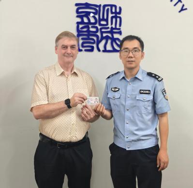 5月21日上午,绍兴市公安局越城区公安分局出入境管理大队副大队长沈瑛到我校为外籍教师安德鲁·唐纳森送来中国外国人永久居留身份证(后简称中国永居证)。国际合作交流处副处长周瑜、外籍人员事务科科长钮敏明、英国籍外教安德鲁·唐纳森参加本次活动。